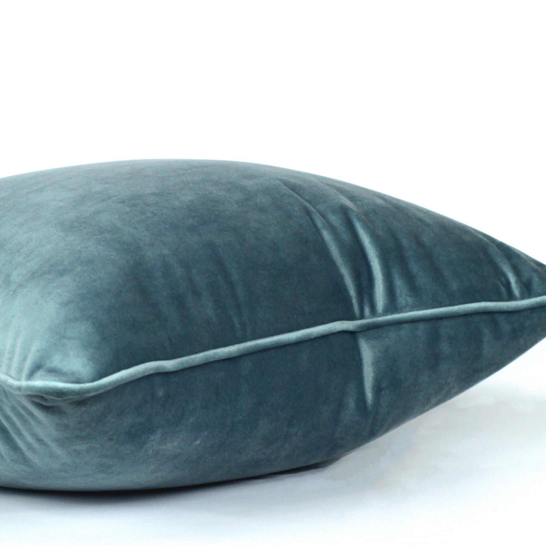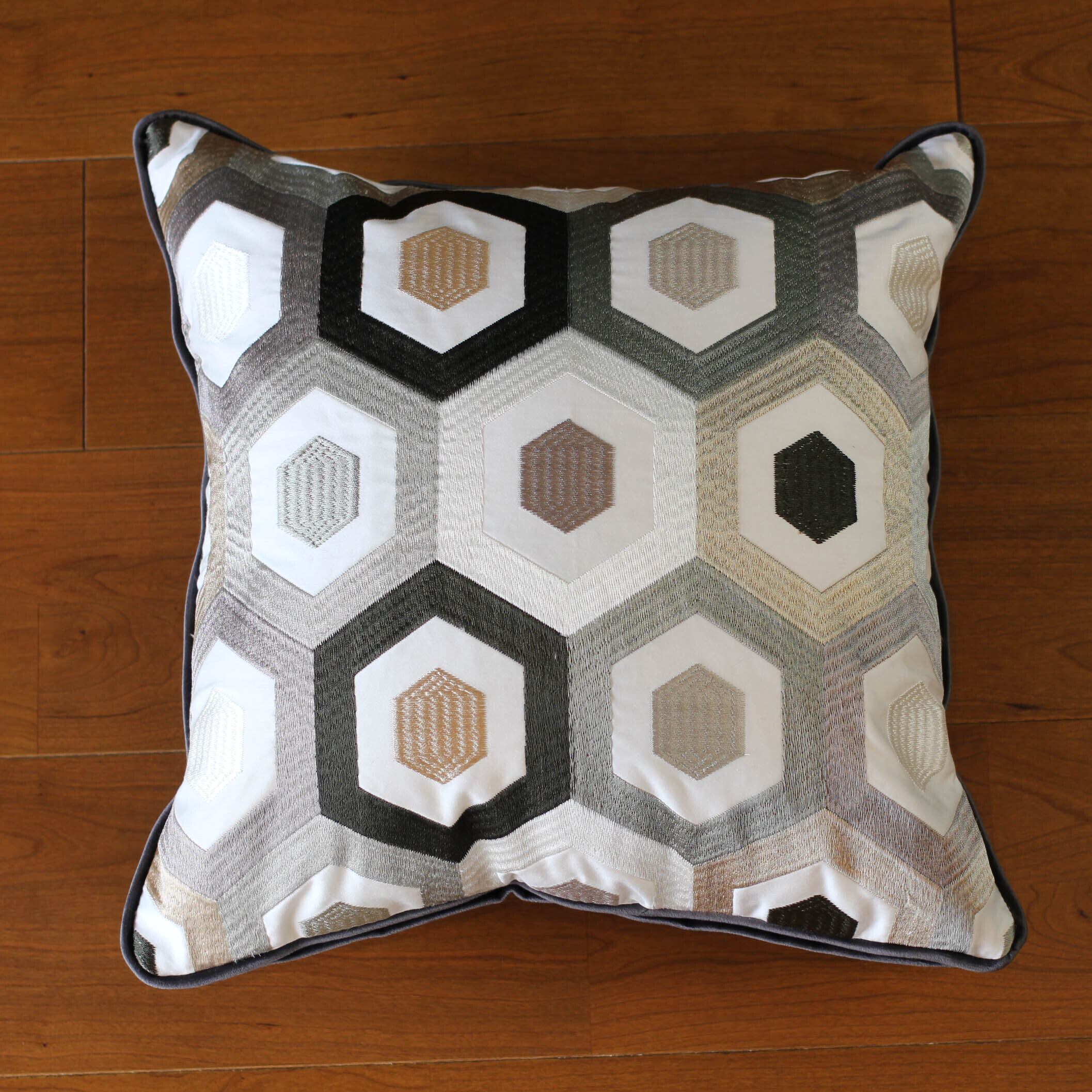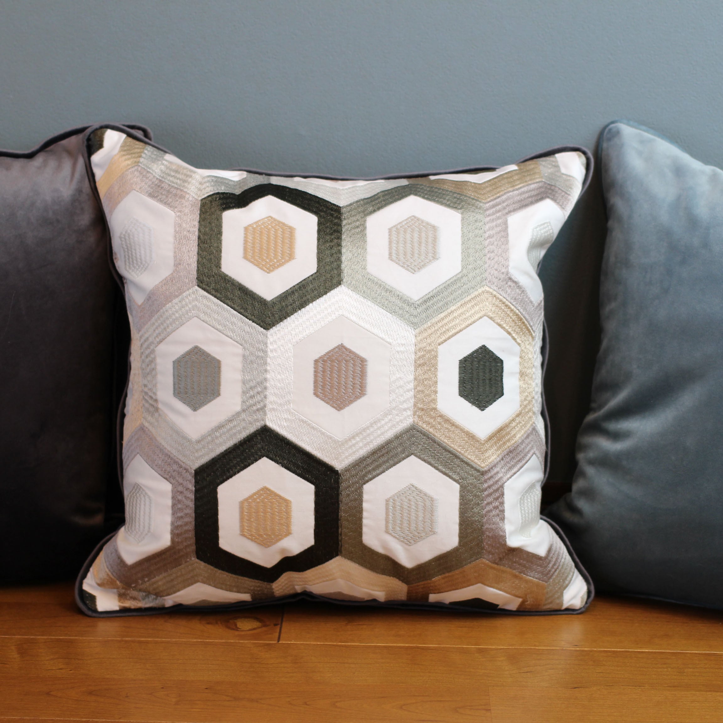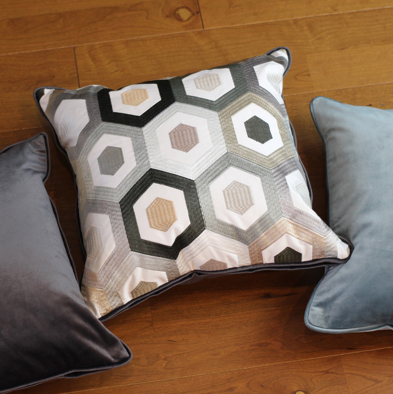 大きな亀の子模様のファブリックを使用したインパクトのあるクッションカバー、濃いめのグレーのシンプルなパイピングクッションカバー、くすみブルーが綺麗なパイピングクッションカバーの3点セットです。