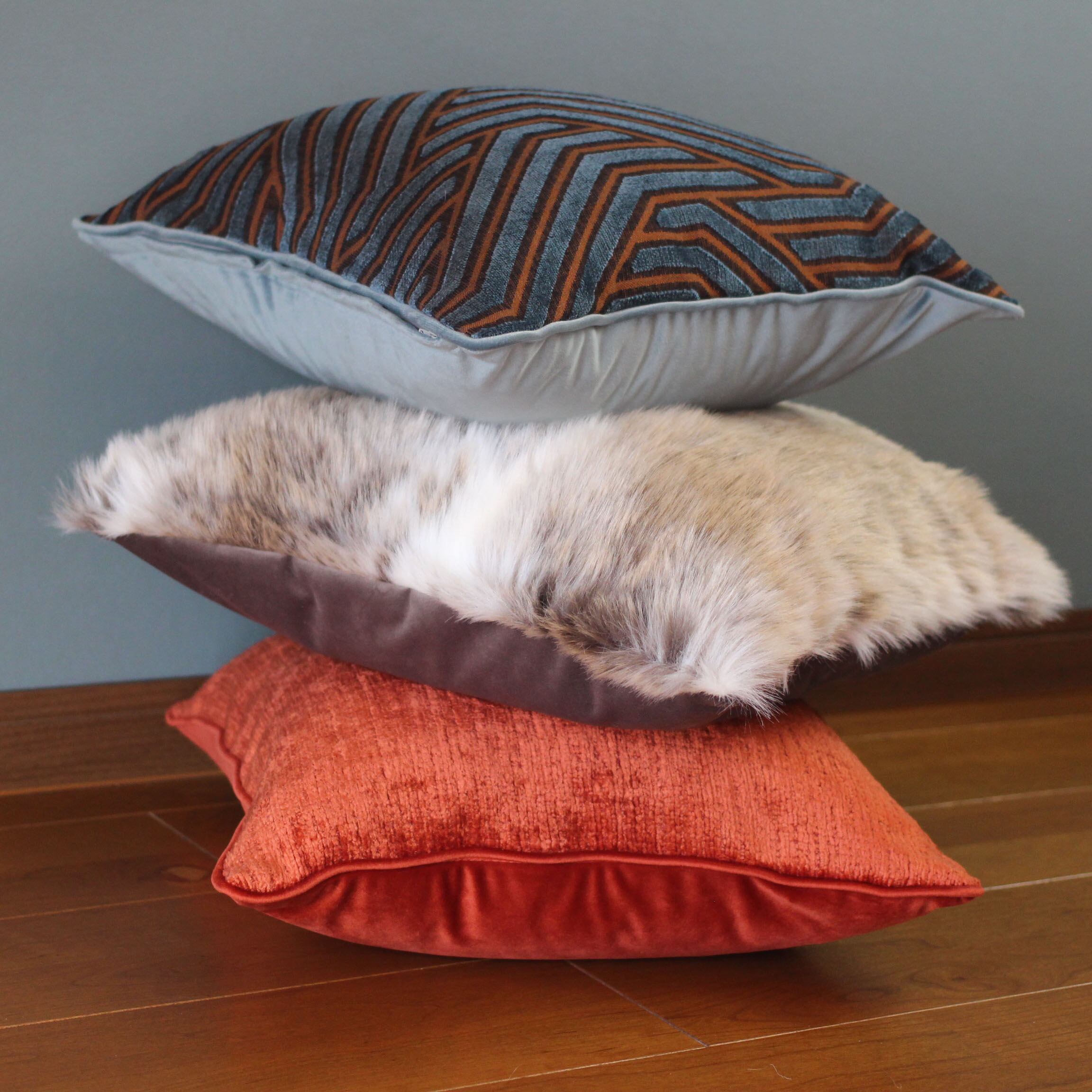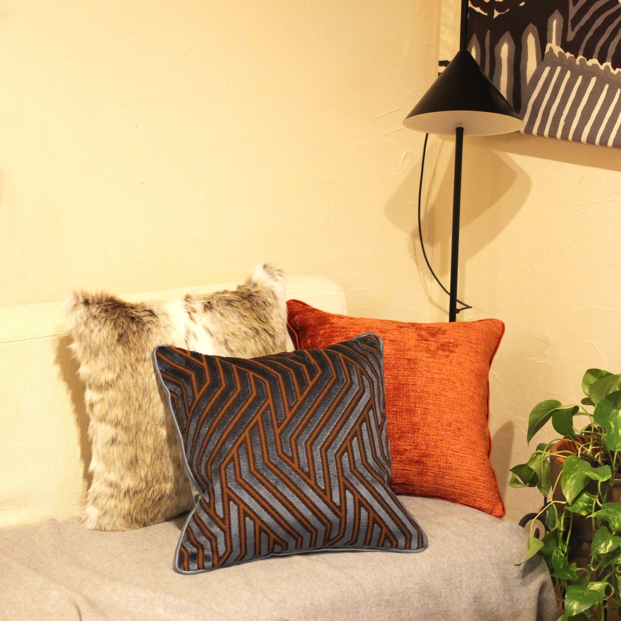 オレンジのクッションは表裏で表情の違う生地を用いてパイピングを施し、無地ながらも単調にならない凝った作り。