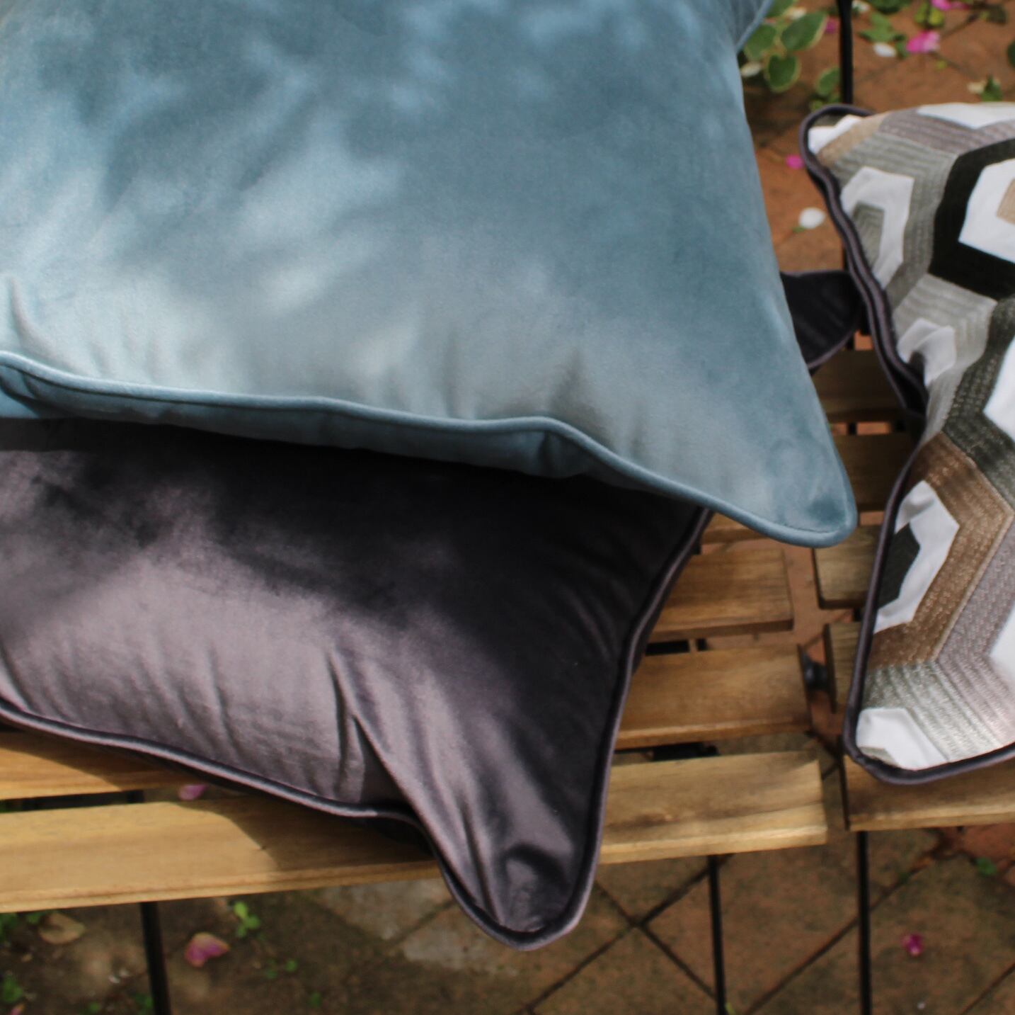 くすみブルーが綺麗なベルベット調の生地を使用しています。共布のパイピング処理を施した高級感のあるクッションカバーです。